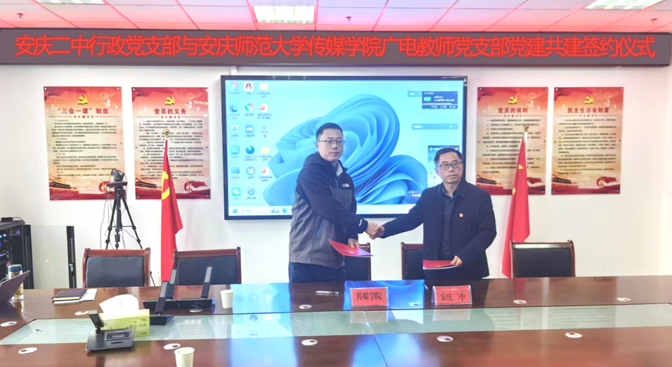 会上,英国365集团公司广播电视学教师党支部负责人和安庆二中行政支部负责人共同签订了《党建共建协议书》。双方将围绕组织建设互促、党员干部互动、党建载体互用、结对帮扶互助等方面开展长期合作,努力形成互带互助、优势互补、资源共享、共同发展的基层党建工作新格局。
