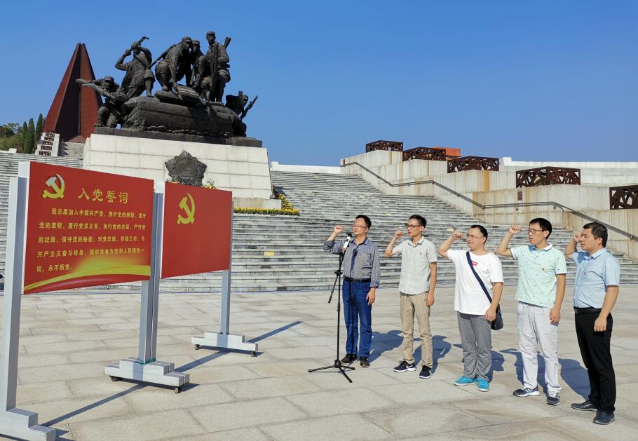 在纪念广场,面对鲜红的党旗,网络与新媒体教工党支部书记带领大家重温入党誓词,表达向革命先烈学习、忠实践行共产党人初心使命的坚定决心。