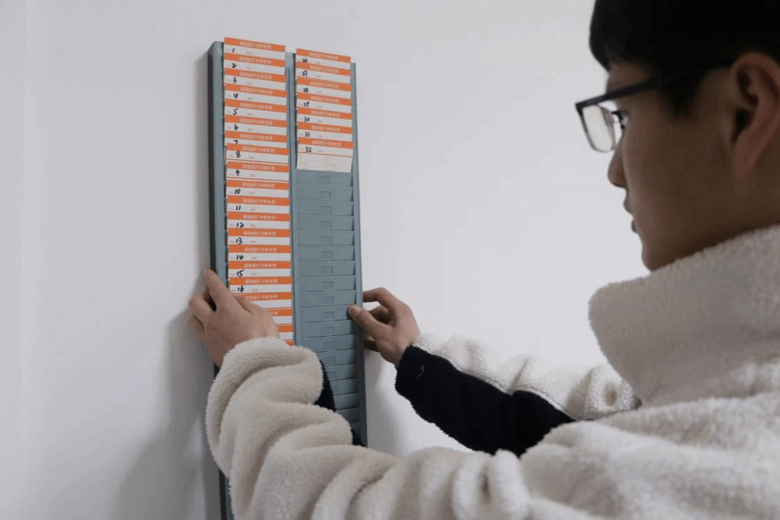 整理摆放桌椅,确定放置位置,撕下挂钩底纸,安装打卡卡袋……3月17日下午,以新闻学专业2020(2)班王士凌为代表的主席团成员们到达考研自习室,合作将打卡机安装好。为了不打扰自习的学生,他们一边低声交流,一边寻找最便利学生打卡的方式。安装完成后,他们亲自体验打卡,确保打卡袋的稳固性以及打卡机器的正常使用。不到半小时,两个教室的打卡机全部安装完毕。