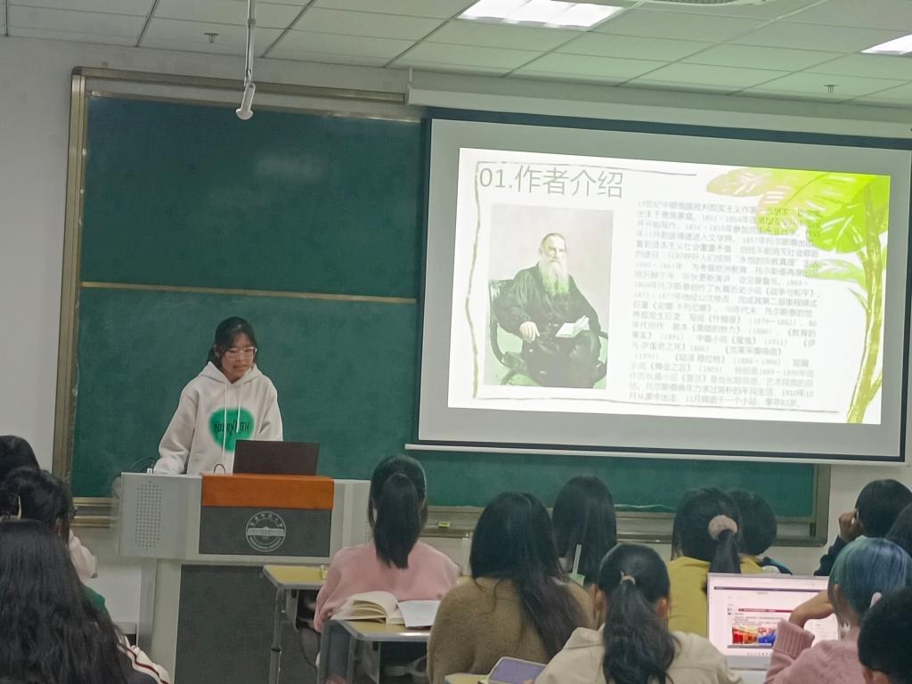 学生们完成了为期两周的阅读后,按照班级学生学号由前到后选取9名学生结合读书笔记与自我阅读感悟,进行读书分享。《人间失格》《追风筝的人》《湘行散记》……从文学小说到游记散文,读书分享会上,9名读书分享者从创作背景、内容简介、好句赏析、读书心得四个方面向班级学生介绍书籍,并借助PPT课件与短视频的辅助,以视听结合的方式将中外名著“搬上”讲台。