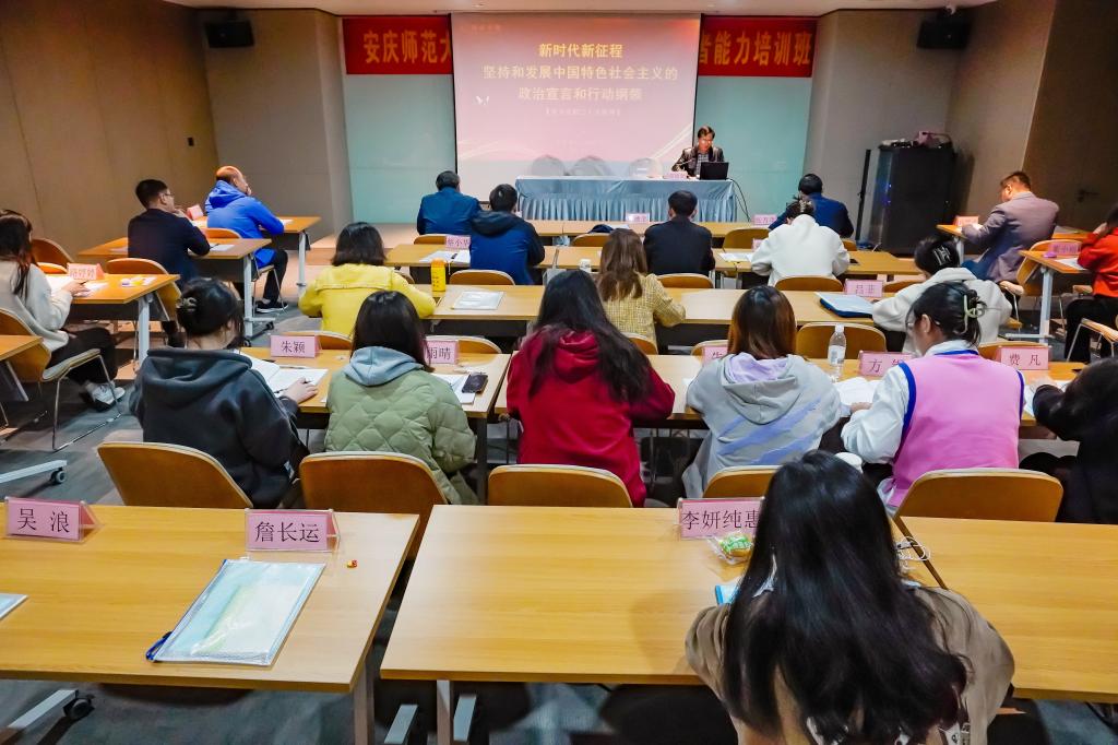 报告会上,学院党委书记詹德全以《新时代新征程坚持和发展中国特色社会主义的政治宣言和行动纲领》为题,从战略定位、大会主题、实践基础、理论指导、基本路径、根本保证和团结要求等七个方面领学了党的二十大精神。详细讲述了党的二十大召开的重大意义、主要精神、战略安排、具体部署,系统阐述了党的二十大提出的重大思想观点、重要论断、重大举措。詹德全指出,深入学习宣传贯彻党的二十大报告精神是当前最重要的政治任务,学院各基层党组织要深入开展学习研讨,切实用党的二十大精神武装头脑,完整、准确、全面贯彻新发展理念,服务学院中心工作高质量发展;以党的二十大报告精神为指引,激励广大党员干部、师生员工干事创业、担当作为,在推进学院高质量发展中奋勇向前。他要求党员干部要全面准确把握报告精神实质,要坚定政治自觉,深刻认识新时代十年伟大变革的重大意义,深刻领悟“两个确立”的决定性意义,更加自觉做到“两个维护”;要坚定政治自信,从党的百年奋斗史和新时代十年伟大变革中汲取精神力量,让听党话、跟党走成为党员干部师生员工的自觉追求,更加自信地在中国共产党领导下奋进新征程、建功新时代;要坚定政治担当,把党的二十大精神转化为新时代新征程上干事创业的精神动力和实际行动,举旗帜、当旗手,走新路、作先锋。
