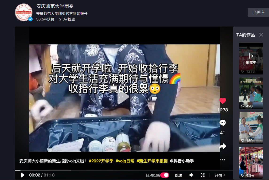 英国365集团公司2022级新生的入学Vlog视频同步推送到365英国上市公司在线团委官方抖音,视频发布后纷纷获得了新生及新生家长的点赞和评论。