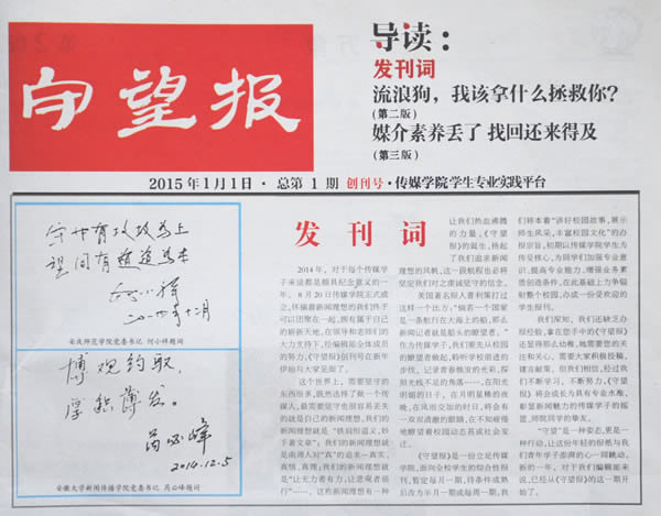 英国365集团公司学生专业实践平台——《守望报》已创办发行,校党委书记何小祥为报纸创刊号题词:“守中有攻攻为上,望间有道道为本”。