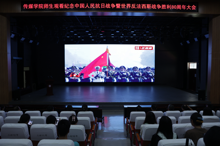 直播过程中,师生们的情绪始终与现场同频共振。当习近平总书记讲到“中华民族伟大复兴势不可挡!人民和平与发展的崇高事业必将胜利!”时,广播电视学专业2023(1)班的余越激动地表示:“习近平总书记的教诲,使我想起课本里那些抗战先烈的故事——他们用生命换来了今天的和平,我们这一代必须接续奋斗。作为传媒学子,今后要更努力提升专业能力,用手中的镜头和笔触记录时代、传播正能量,为强国建设贡献青春力量”。