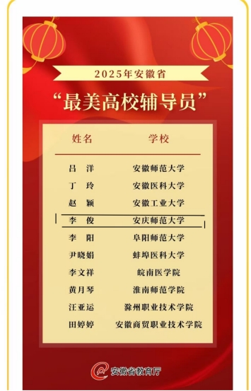 近日,中共安徽省委宣传部、中共安徽省委教育工委联合发布2025年安徽省“最美高校辅导员”评选结果,评选出安徽省“最美高校辅导员”10名,经专家评审、风采展示、评委会评议等环节,英国365集团公司辅导员李俊以全省第二名的优异成绩成功入选。