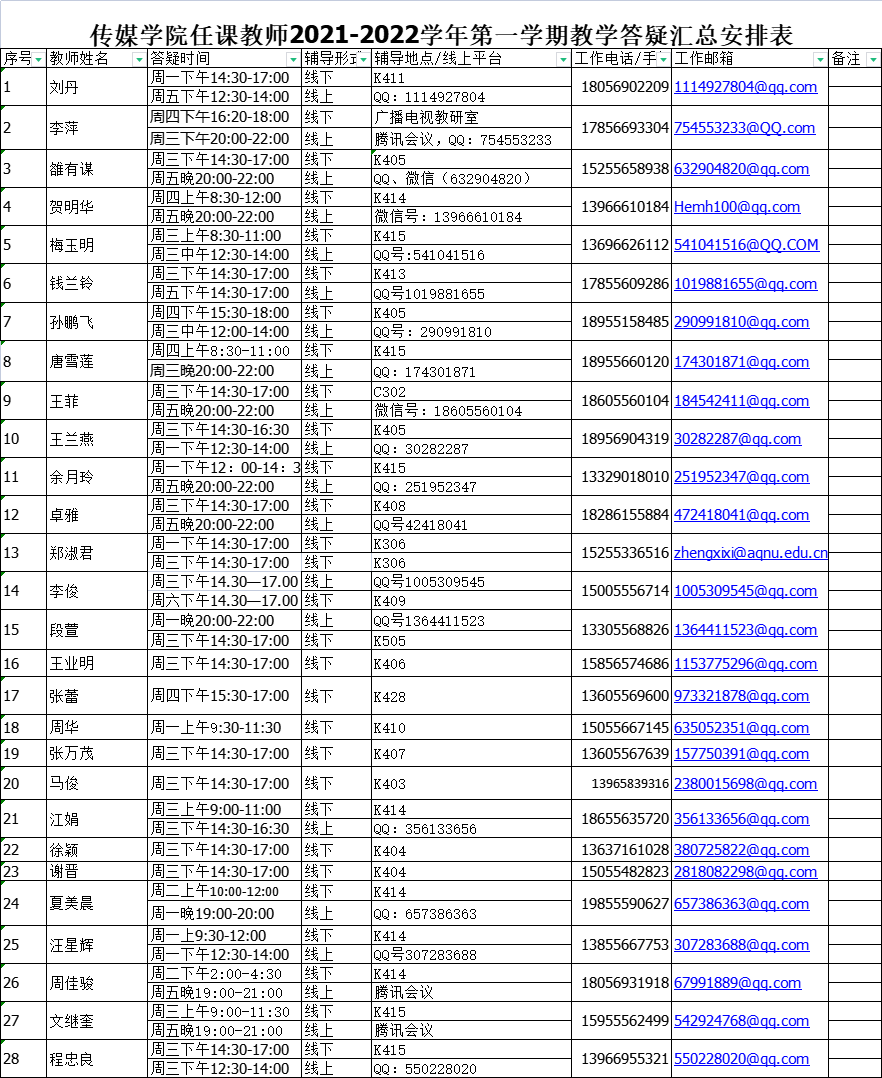 英国365集团公司任课教师2021-2022学年第一学期教学答疑汇总安排表